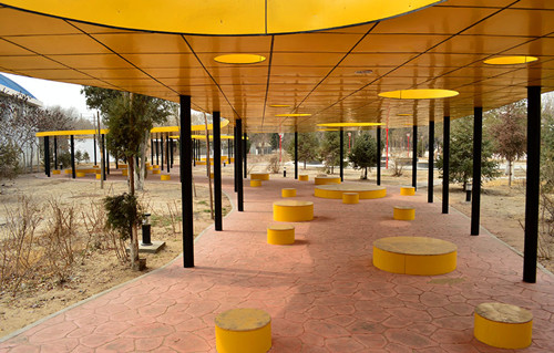 绕过蜿蜒的艺术长廊,橘色的色彩带着一份纯和历练,彰显着青春的活力,将广场上散落的树木合理安排在每一个可以利用的空间,彼此贯穿,显得有条理和层次。