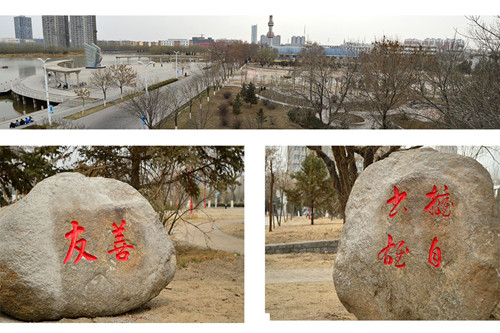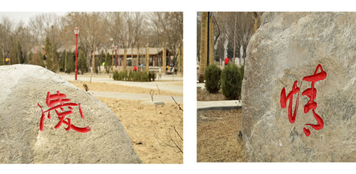 领略过岩石文化的深邃,细细品味这里每一个苍劲有力的文字背后的故事:“和、仁、礼、义、孝”正是中国传统文化中所尊崇的为人之道,所感慨的大气之韵;“爱国、诚信、敬业、友善”正是公民个体应遵循的社会主义核心价值观基本准则。而走在北侧的小道上,一东一西两块石头上分别镌刻的“情”、“缘”两字不由让人解读为“行走于情缘小道”之上。