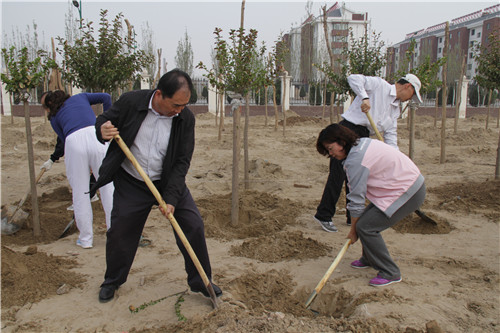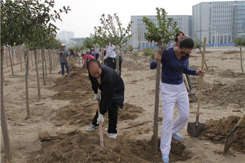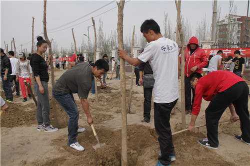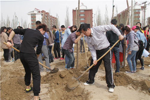 在A区东大门,校领导和人文学院、政法学院、教育学院等八个学院的师生共同合作,剖土栽苗,松土浇水,认真细致地栽下每一棵树苗。人文学院一名大二的同学满怀信心地说:“希望我种下的这颗树苗能够茁壮成长,为校园环境的改善贡献力量。”活动中,老师们还不时指导同学们如何栽树,并讲授正确的浇水方法,保证树木的栽种成活率。经过两天努力,在师生们的通力配合下,在A区20亩地共栽种金叶榆、白腊、丝绵卫矛三个树种共计2000余棵。