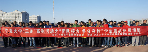 【宁夏大学新闻中心讯 团委、土木与水利工程学院】11月30日,由校团委主办,土木与水利工程学院团委、学生会承办的宁夏大学“三走”系列活动之“团队接力,争分夺秒”学生素质拓展活动在校本部C区田径场成功举办。校团委副书记肖功国,土木与水利工程学院党委副书记张强、校学生会主席夏金柱及各学院学生会主席和学生代表500余人参加并观看了本次活动。