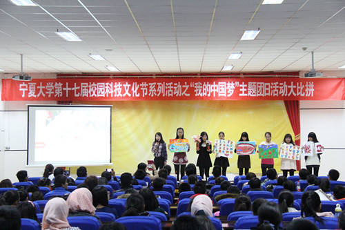 【宁夏大学新闻中心讯 团委】11月18日,由校团委主办,校学生会承办的宁夏大学·宁夏电信“天翼杯”第十七届校园科技文化艺术节系列活动之“我的中国梦”主题团日活动大比拼活动在校本部A区文科楼东报告厅举行。校党委组织部副部长、党建工作办公室主任奥海玮,党委宣传部副部长武林波,团委副书记马慧,校学生会主席夏金柱及各学院学生代表300余人参加并观看了本次比赛。
