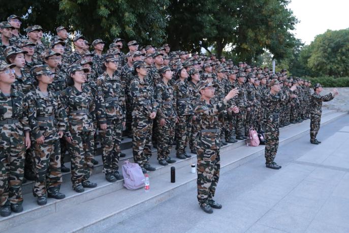 挺拔身姿,抬头挺胸,站出军人的气势,利落干脆,嘶声呐喊,吼出军人的气概。第一次的练习中,同学们声调不一,和音困难,军歌的势如破竹之感毫无体现,唱的似乎有些狼狈。但亲爱的学姐们放缓速度,耐心满满,一字一句的教唱军歌,紧跟音调。反复纠正,反复调整,终于回到正轨。