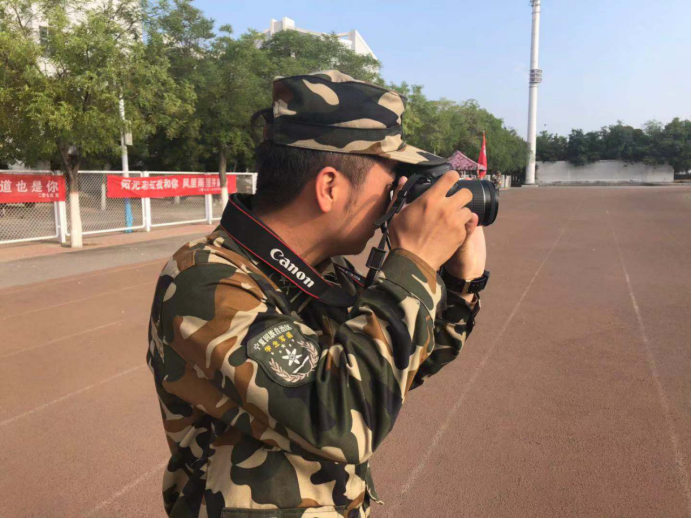 军训依然,有人忙碌奔波不息,他们是青春纪念册的编撰者,几斤重的单反,坠在胸前如砣般,脚步时而不动,时而急促,眼眸转动不消一刻,力求捕捉每一隅景致。军姿正步走,迅速定好角度,一样的站立不动,唯独多的是手中稳端的相机,看他,双腿一分就此定住, 挺着腰板,单反举在面前,头微伸,一眼紧闭,一眼视孔调焦,再睁开,打量前方,左腿往前一迈,微蹲,蹙眉,宛如雕塑,静待着精彩的发生。