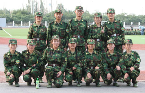 身着戎装,学生新兵英气夺人,势方显。昔日长发昳丽,今弃之,男不得过寸而女束之。紧风纪之扣,系收腰之带。肃军容,严军纪,以会动员,寄希望之。上无掩日之高篷,下无顺脚之碧草,无风无云,汗浸衣而流之,然心志不惑,劳其筋骨,行拂乱其所为,增其所不能而降之以大任。