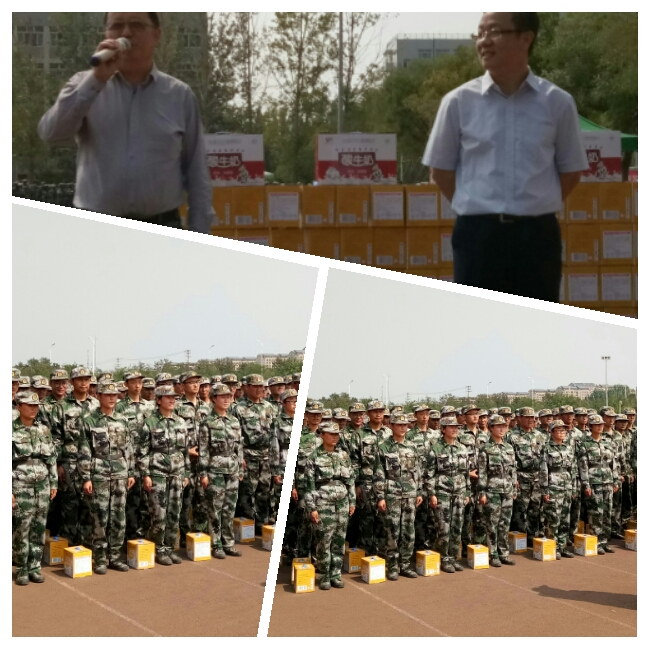 9月16日上午,一切都如同往常一样。炎热的军训场上,迎着炽热太阳的同学们认真的进行着训练,汗水浸透了衣服,紧紧的贴在了身上,但是没有人在意到这些,所有人都在全身心的投入到训练中,操场上的气氛严肃而紧张。就在这时从远处驶来一辆车,车上装载着一批黄色的箱子。这辆车停在了距同学们的不远处。这辆车的出现打破了寂静严肃的气氛,引得训练中的同学们纷纷投来好奇的目光,不知这是要做什么。随后,就看到辅导员何佳老师,徐楠老师带领着后勤组的同学将车上的黄色箱子迅速卸下。有的同学们发现,卸下的箱子里装的全都是的牛奶,心中感到很疑惑,向一旁的学长们投去询问的眼光。一旁的学长看到后,相视无语,微微一笑对同学们说到:“这是学院的福利。”听到这样的答案,同学们仿佛明白了什么。之后的训练中目光更加坚定,口号更加响亮。更加认真的投入到训练中。