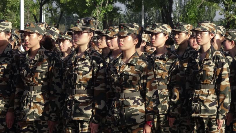 暂抛华服美甲,身着黄绿军装,立似军人展。
