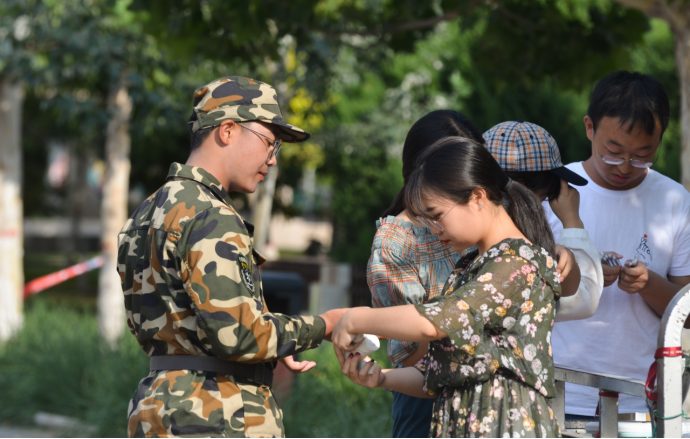 对于大多数的女生来说。最具有挑战性的,无疑还是走正步。“上身挺直,脚尖绷直,脚掌平行于地面,离地25公分……”,教官的指导一遍遍在耳畔回响,也一遍遍地刻在自己的心里,但我老是站不稳步子,心中不禁暗自着急。如今,身为军人的荣誉感和经管人肩负的仪式感促使我找问题,求经验,炎炎烈日还是放肆地炙烤着大地,硬邦邦的黑胶鞋裹挟着脚,脚底烧的厉害;定步子时,双腿麻木,时间就凝固了一样,空气中只留下了风吹过叶子飒飒作响的声音。我无比清楚地感觉到汗水自脸颊顺着脖子,流到背,内衫也都浸湿了。